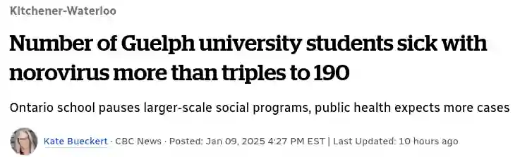 Bueckert, K. (2025, January 10). Number of Guelph university students sick with norovirus more than triples to 190. CBC. https://www.cbc.ca/news/canada/kitchener-waterloo/guelph-university-students-sick-gastroenteritis-1.7427345